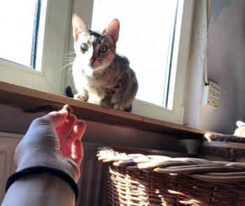 Noa ist eine liebe Katze. Sie lässt sich streicheln. Aber sie ist auch ängstlich, sie zuckt zusammen, wenn man eine zu schnelle Bewegung macht.. Was sie wohl erlebt, bevor man sie bei der Tierschützerin ausgesetzt hat? Vielleicht ist sie geschlagen worden, oder Kinder haben in ihr nur ein Spielzeug gesehen. Schön wäre es, wie gesagt, wenn die zarte Maus bald en Zuhause fände, eine stabile Umgebung, in der sie endlich richtig Vertrauen schöpfen kann.