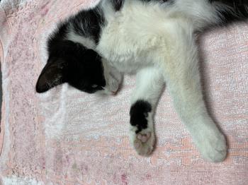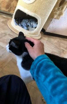 Er ist zwar immer noch ängstlich und versteckt sich, aber er frisst bereits Leckerli aus der Hand und bewegt sich auch immer mehr frei im Raum, wenn man dabei ist. Mit anderen Katzen hat er keine Probleme.